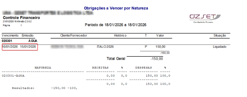 Se a obrigação tiver algum desses dados (Emissão, Vencimento, Liquidação ou Conciliação) dentro deste período, a obrigação será exibida.