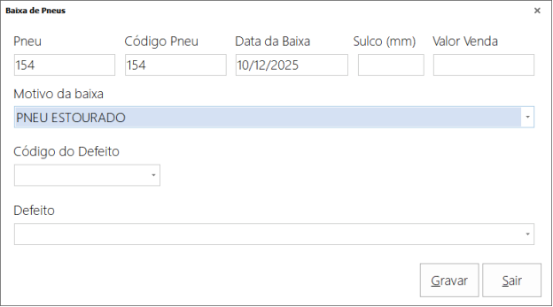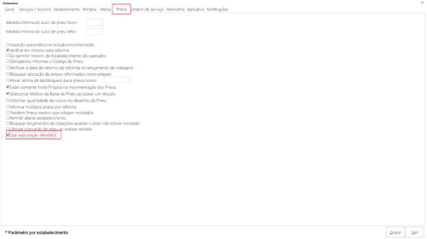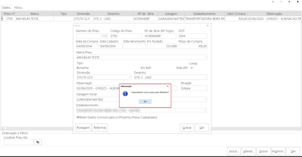 6 - Baixa de pneus Na primeira importação de pneus, aqueles que já estão com situação baixada não são importado. Porém, quando um pneu é importado como ativo e posteriormente e realizada a baixa, a situação e atualizada automaticamente no Afere Fácil