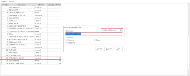 4. Motivos de movimentação. No Siga, será preenchido um código externo que representa o motivo de movimentação. Na rotina ARQUIVO > CONTROLE DE PNEUS > MOTIVO DE RETIRADA DE PNEU, deve ser informado o código externo correspondente ao motivo de movimentação.