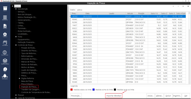 Após realizar as aferições, dentro do Siga na rotina ARQUIVO>CONTROLE DE PNEUS>INSPEÇÃO DE PNEUS>IMPORTAR AFERE FÁCIL, assim exportando as informações para o sistema