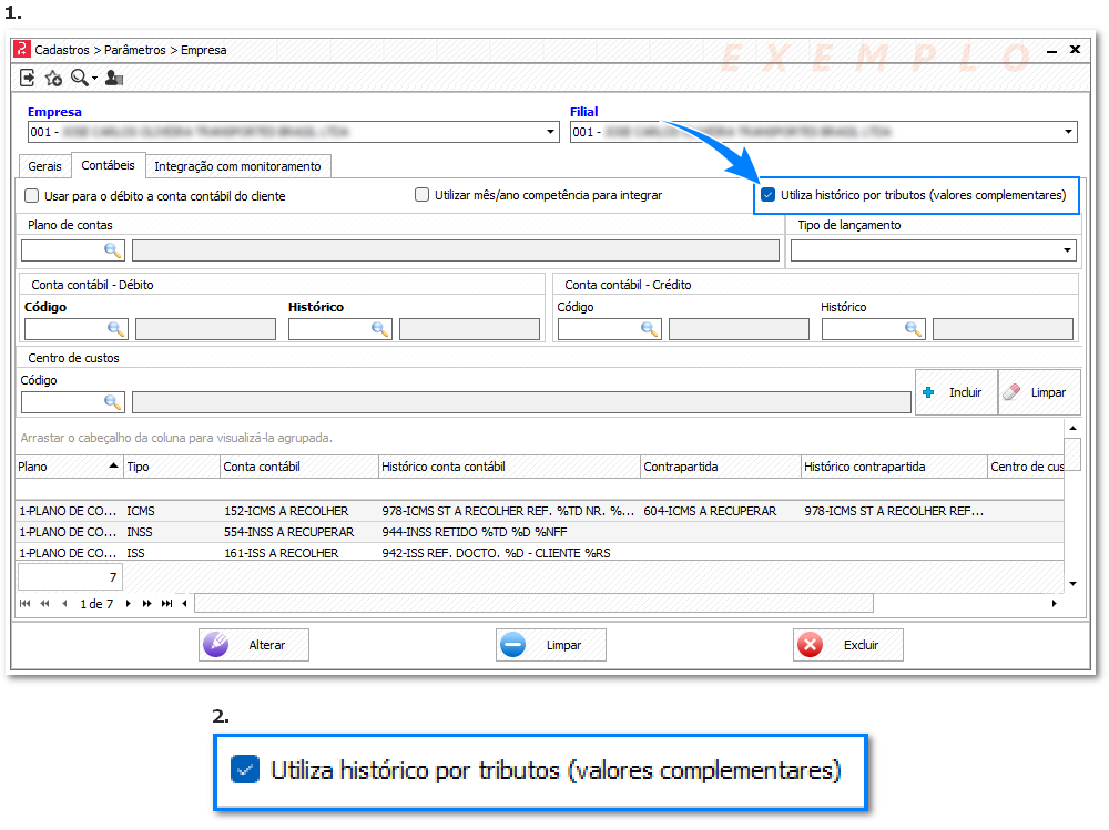 Na tela de Parâmetros da Empresa, na aba Contábeis, foi implementado uma novo parâmetro com o nome "Utiliza histórico por tributos (valores complementares)", conforme destacamos nas imagens abaixo.