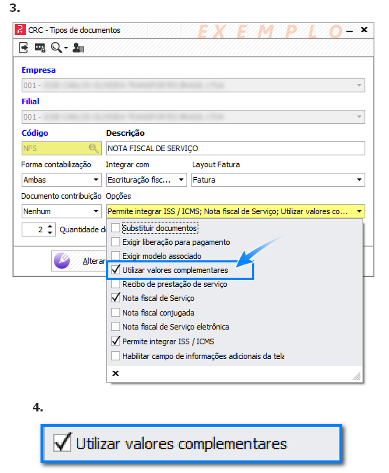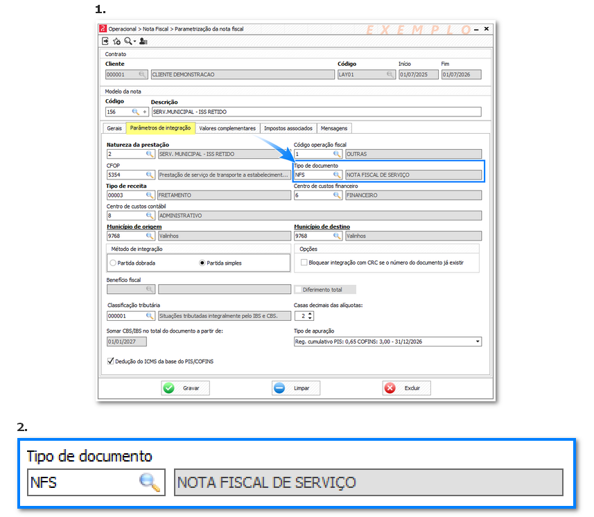 Novo parâmetro para utilização dos históricos em documentos que usam valores complementares Menu Cadastros >> Parâmetros >> Empresa Com esta nova flag marcada, o sistema passará considerar os históricos contábeis para a integração dos impostos das notas configurados na mesma tela. Mas isso quando o tipo de documento associado na parametrização da nota fiscal (imagens 1 e 2); em Operacional > Nota fiscal > Parametrização da Nota fiscal, aba Parâmetros de integração), utilizar valores complementares (imagens 3 e 4).