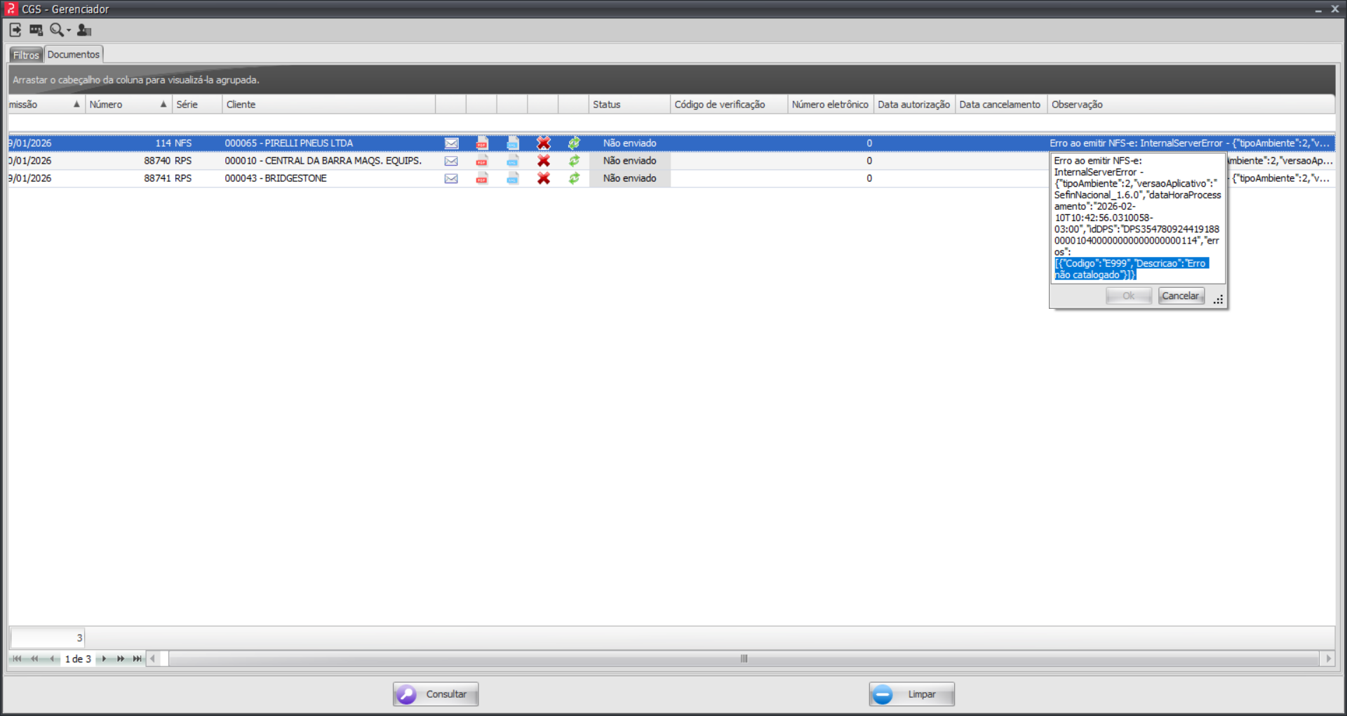 Erro, quando houver alguma inconsistência, sendo apresentada a respectiva mensagem para análise e correção.