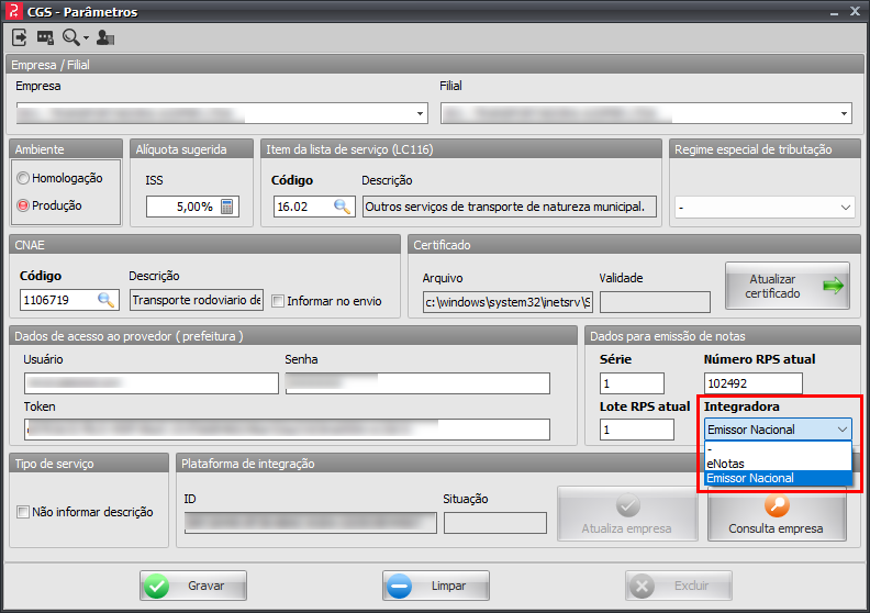 Defina o campo Integrador como Emissor Nacional;