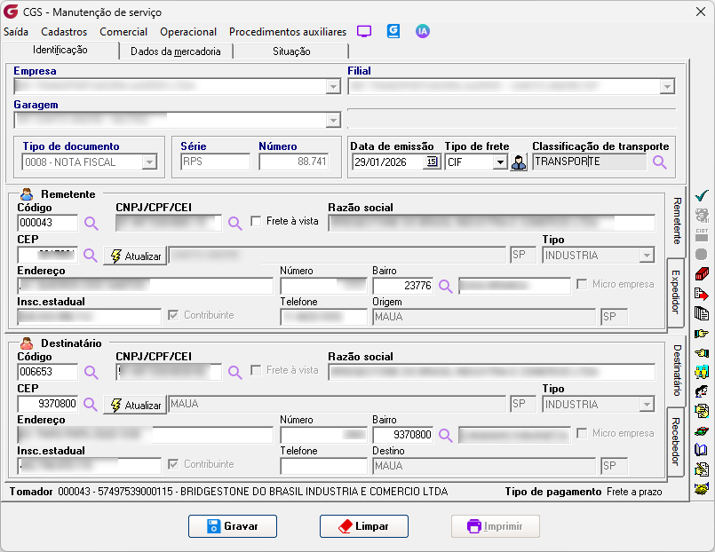 Serviço de Frete / Manutenção de Serviço;