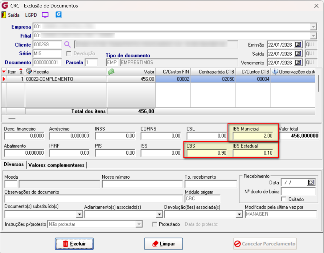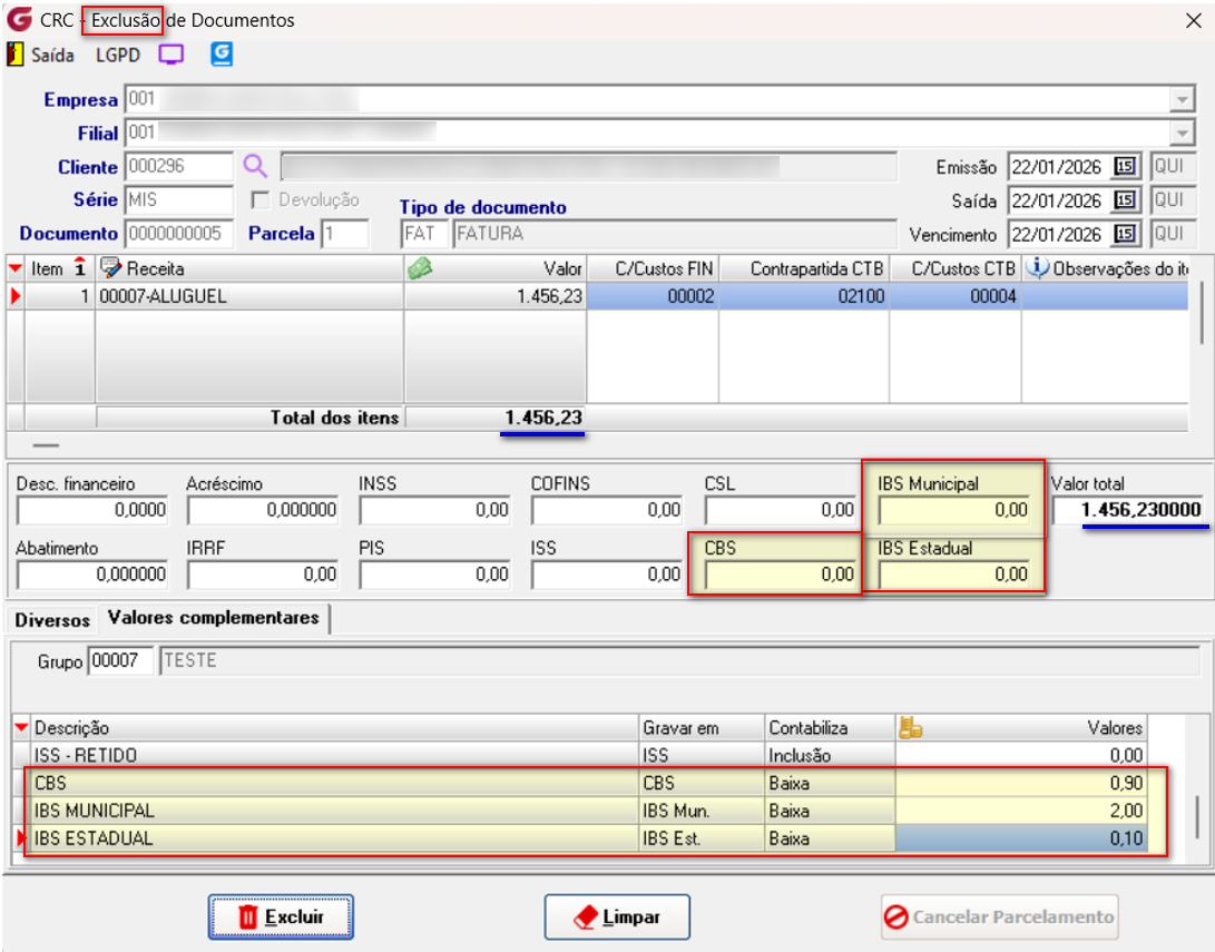 Foram adicionados na tela de exclusão os campos CBS, IBS Municipal e IBS Estadual para fins de visualização.