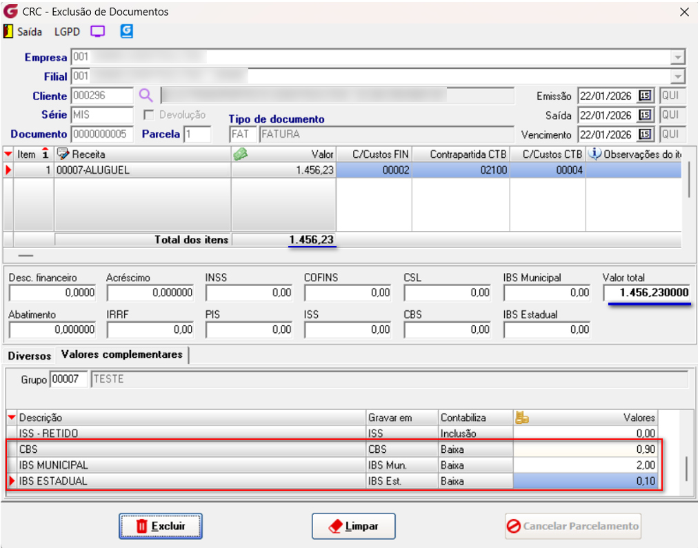 Na tela de exclusão os tributos ficam visíveis na aba 'Valores complementares'.