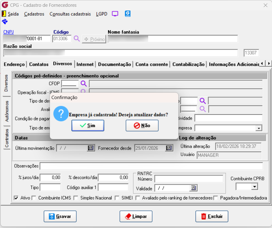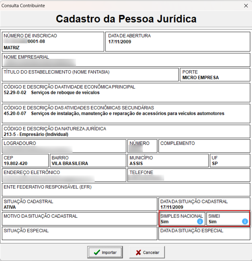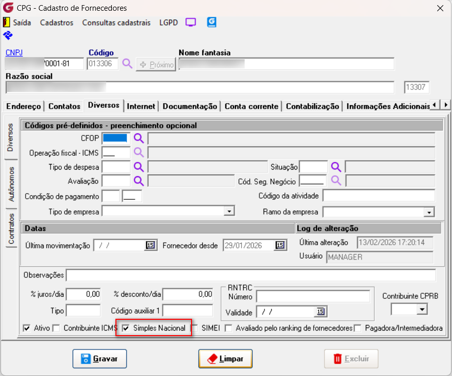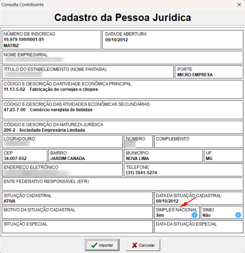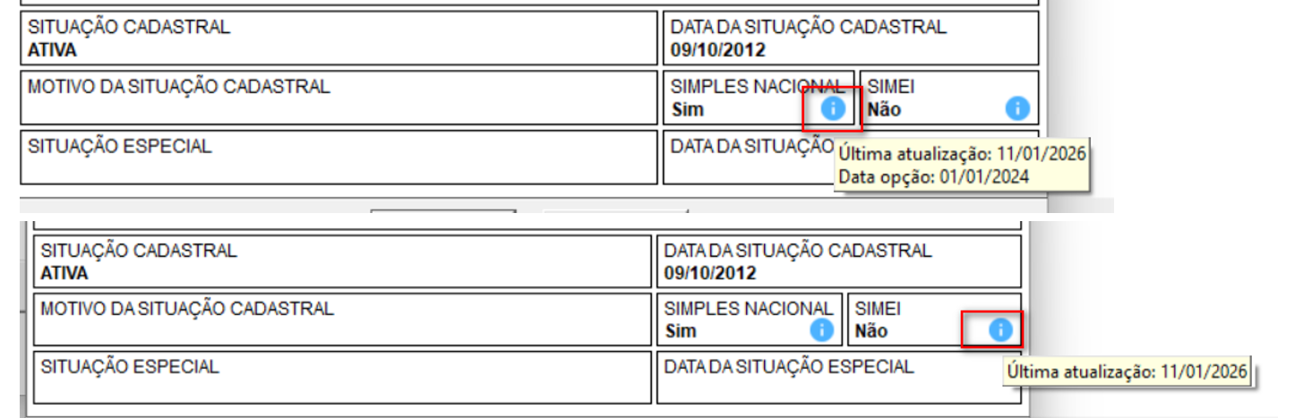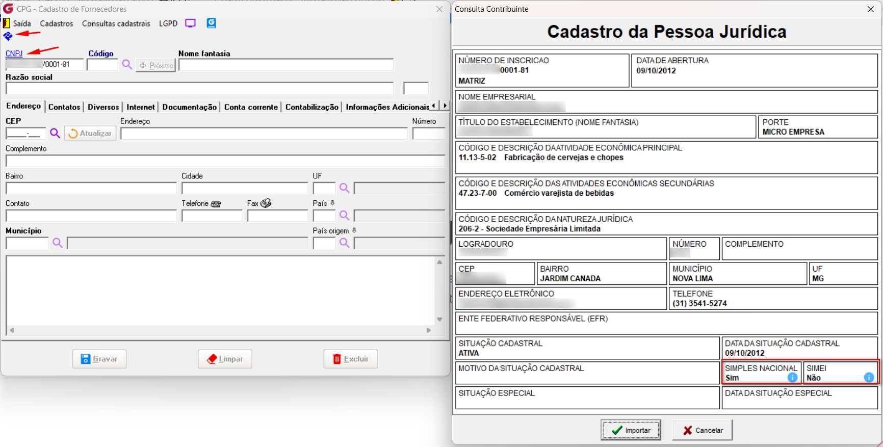 Ao realizar essa ação, os dados serão atualizados e, caso o fornecedor seja MEI ou optante pelo Simples Nacional, essas informações também serão atualizadas automaticamente.