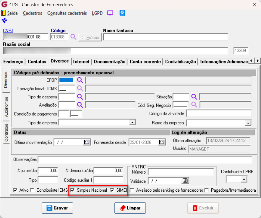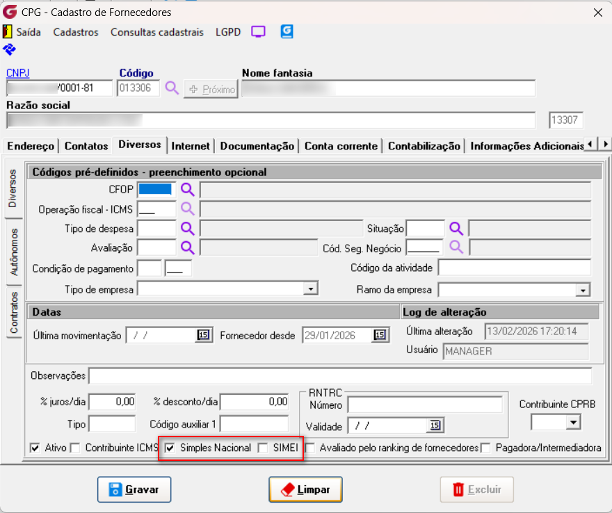 Implementamos a consulta e atualização automática do cadastro de Fornecedores quando realizado com a consulta na Receita Federal e o mesmo for do Simples Nacional e/ou SIMEI, preenchendo automaticamente esses campos ao finalizar o cadastro.