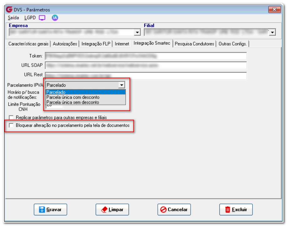 Na tela de parâmetros o usuário irá informar o Token e URL do WebService da Smartec e informar qual vai ser a forma de parcelamento do IPVA. Parcelado, Parcela única com Desconto, Parcela única S/ desconto.