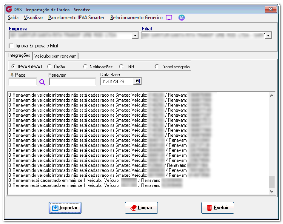 No menu Movimentação> Importação> Importação Smartec, é possível realizar a importação dos dados, informando Empresa, Filial, o veículo (caso deseje importar um veículo específico), e a data base. Ao final, é possível ver o log dos renavam que não foram importados.