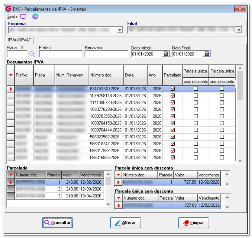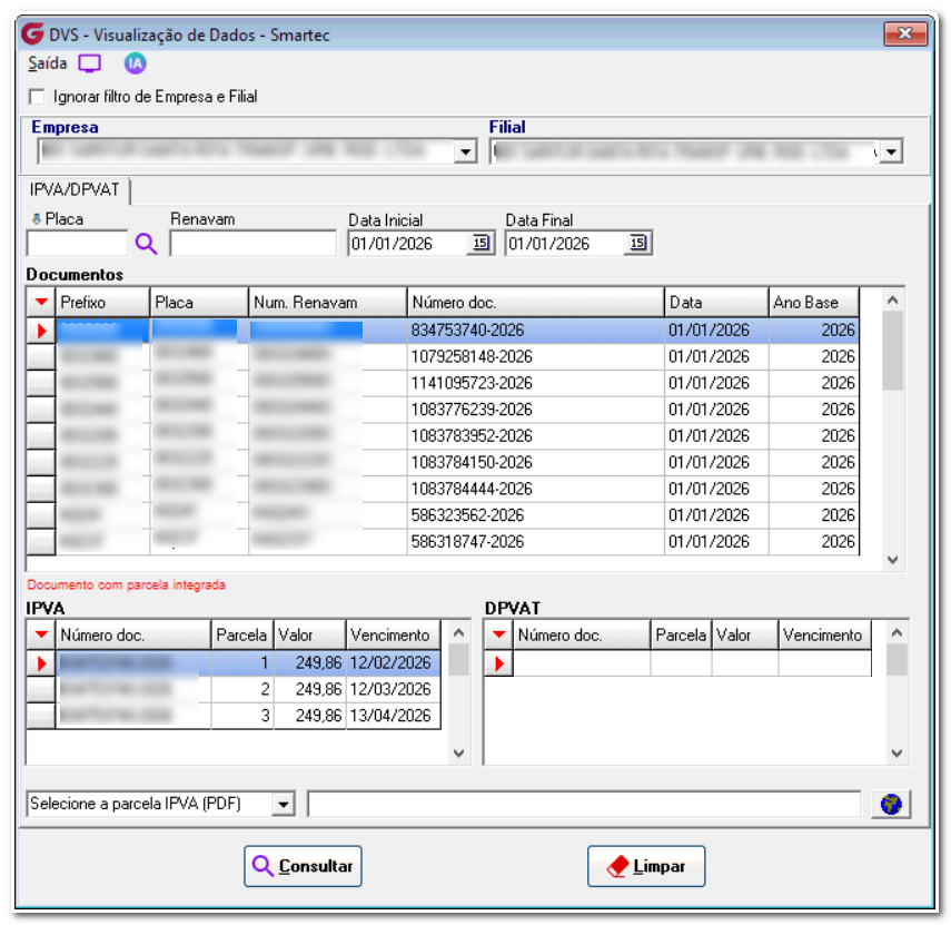 Após a importação, é possível, no menu Consulta> Documentos Importados Smartec, visualizar as informações de IPVA e DPVAT importados.