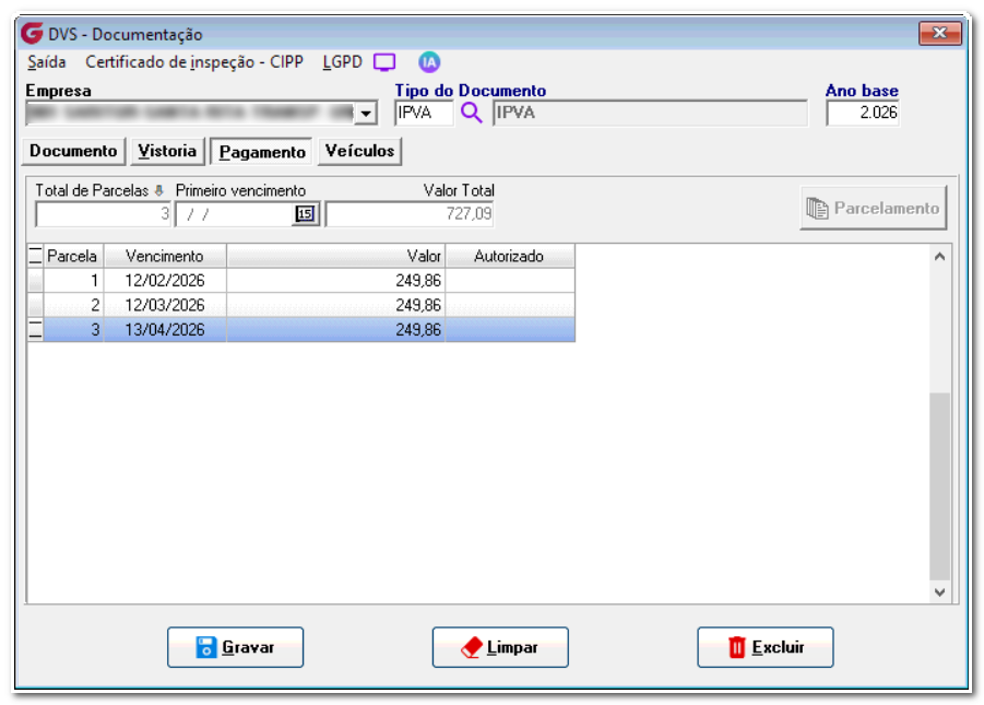 Ainda nessa tela o usuário tem a opção de marcar o parâmetro “Bloquear Alteração no parcelamento pela tela de documentos”, este parâmetro foi criado para evitar que após a importação e disponibilidade dos dados do IPVA no sistema o usuário possa alterar datas de vencimento.