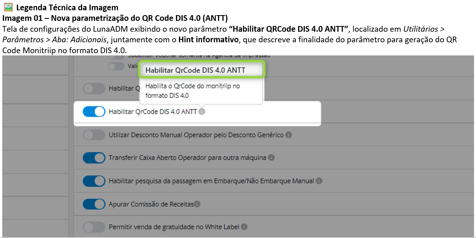 Caminho de acesso: Luna ADM [Caminho]: Utilitários > Parâmetros > Aba: Adicionais > Habilitar QRCode DIS 4.0 ANTT |