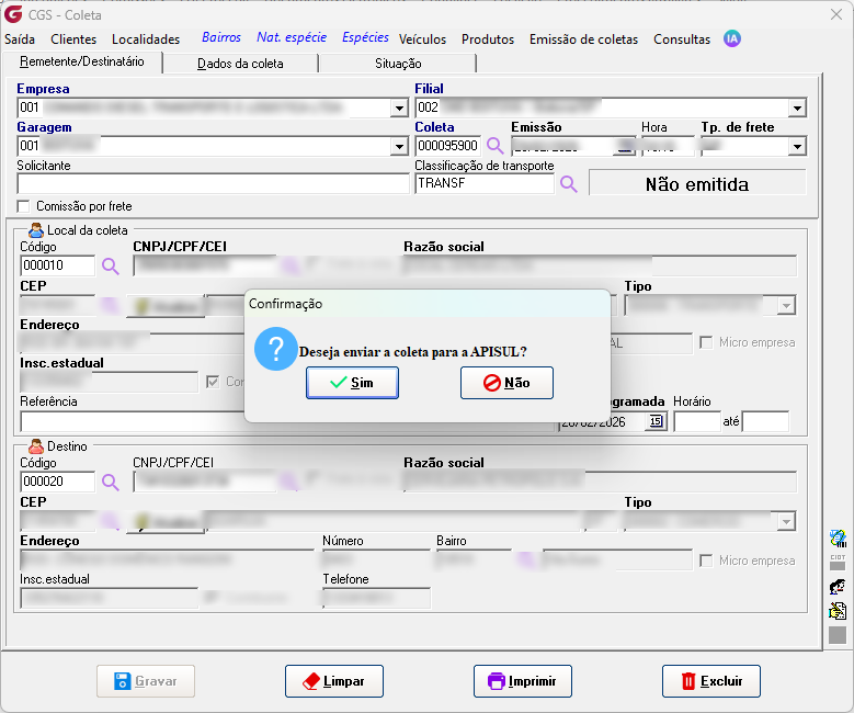 Após realizar as configurações necessárias, ao emitir a coleta, o sistema apresentará uma mensagem em tela perguntando se deseja enviar a SMP para a Apisul.