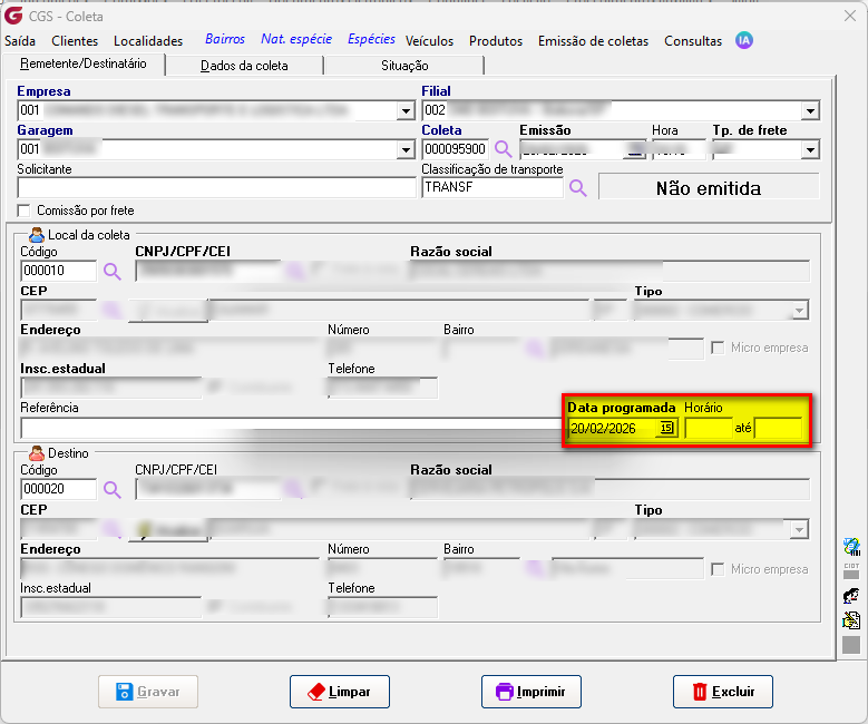 A data de início da viagem será considerada a partir da data programada com a hora “até”, sendo este o padrão para envio na integração.