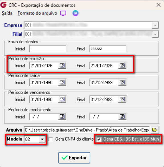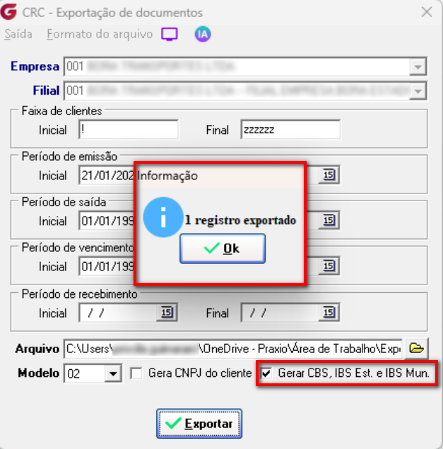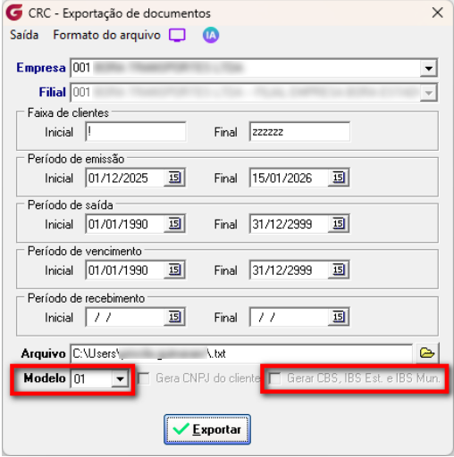 Na tela de exportação foi criada opção chamada "Gerar CBS, IBS Est. e IBS Mun.", esta só ficará habilitada quando o modelo 02 for escolhido.