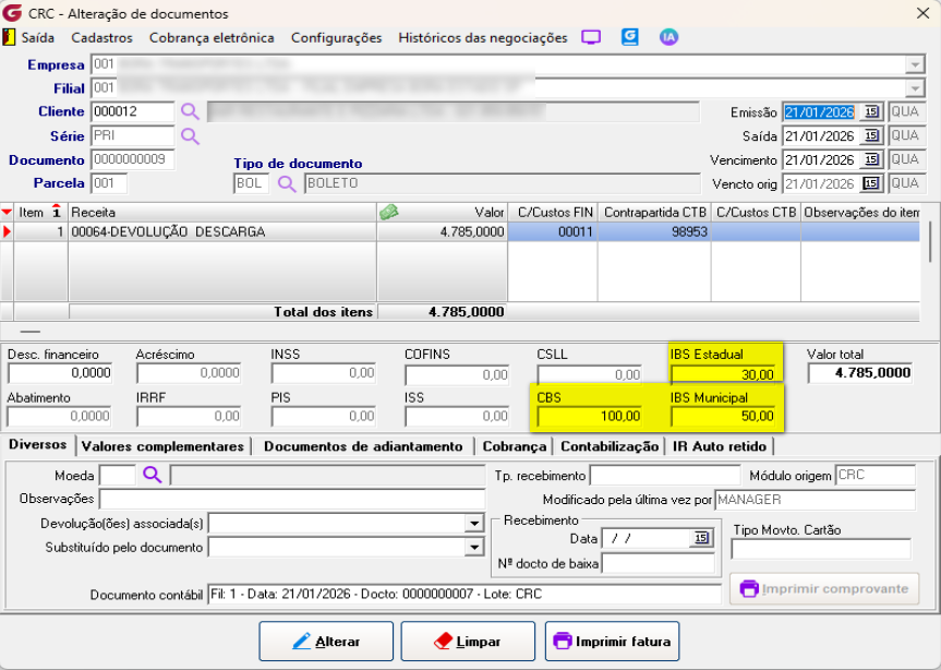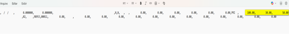 Para exemplificar como fica a exportação dos valores referentes aos impostos CBS/IBS Estadual e IBS Municipal incluímos um documento no sistema contendo 100,00 para CBS / 50,00 IBS Municipal e 30,00 IBS Estadual.