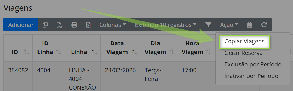 Nova funcionalidade “Cópia por Seleção” e inclusão do campo Serviço. O que há de novo: Foi implementada no Portal Luna ADM uma melhoria na rotina de cópia de viagens denominada “Cópia por Seleção”. Com essa nova funcionalidade, passou a ser possível selecionar dias específicos diretamente no calendário apresentado no modal da rotina, permitindo que a cópia das viagens seja realizada de forma mais flexível, precisa e alinhada à necessidade operacional. Anteriormente, o sistema permitia a cópia apenas por meio de um período previamente informado, sem a possibilidade de escolha individual das datas. Além dessa evolução, foi adicionado o campo “Serviço” tanto na rotina Cópia por Período quanto na nova Cópia por Seleção.