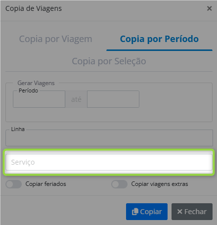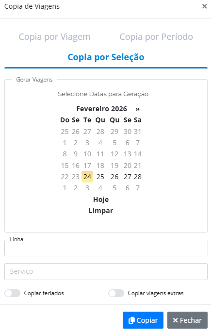 Figura 02 - Imagem ilustrativa do modal da nova rotina “Copia por Seleção”,que apresenta um calendário interativo para navegação e seleção de datas específicas para a cópia das viagens. O modal também possui o campo “Serviço”, que permite realizar a cópia com base em um serviço já existente. Figura 03 - Imagem ilustrativa do modal da rotina “Cópia por Período”, que também passa a contar com o campo “Serviço”, permitindo realizar a cópia com base em um serviço já existente.