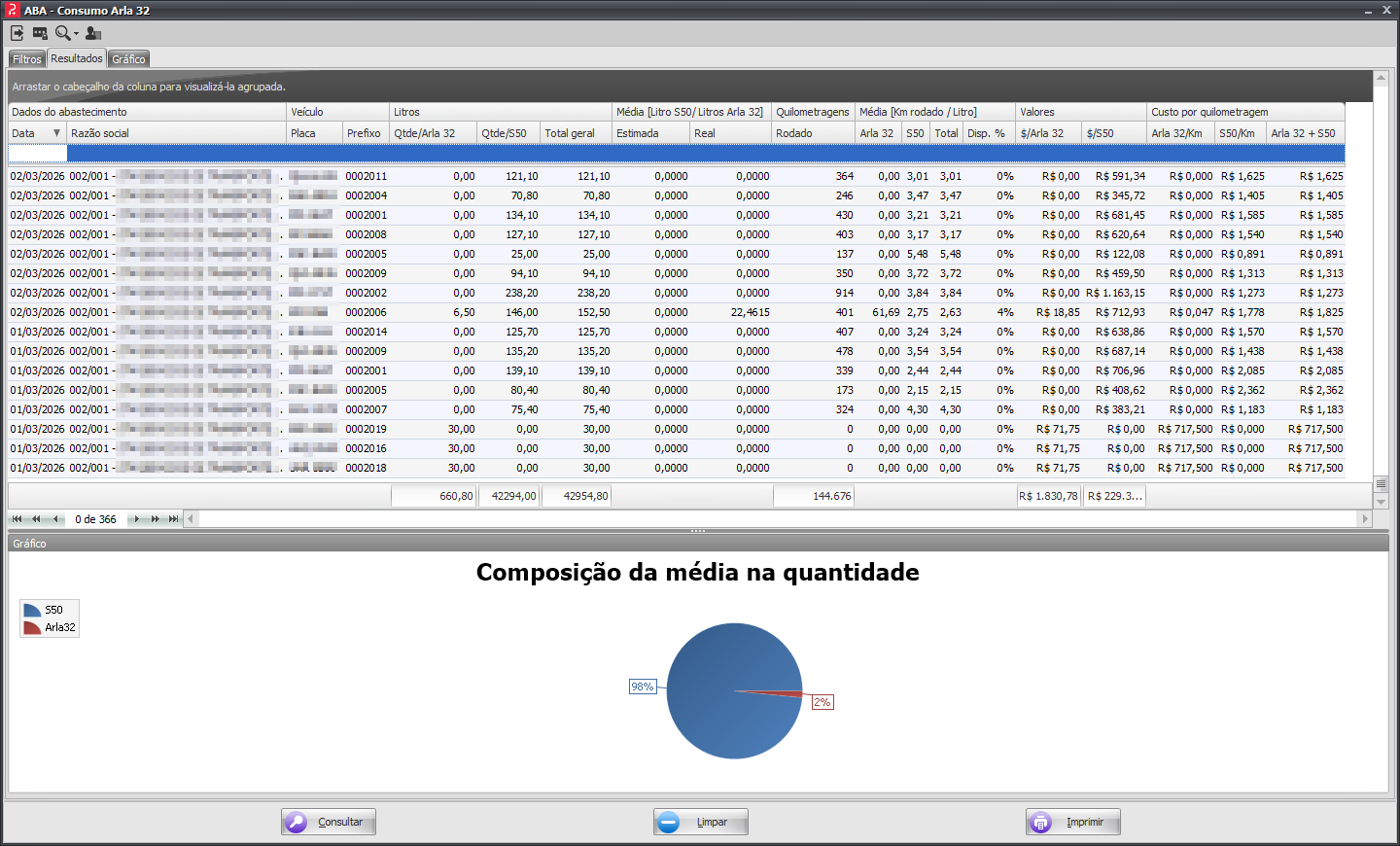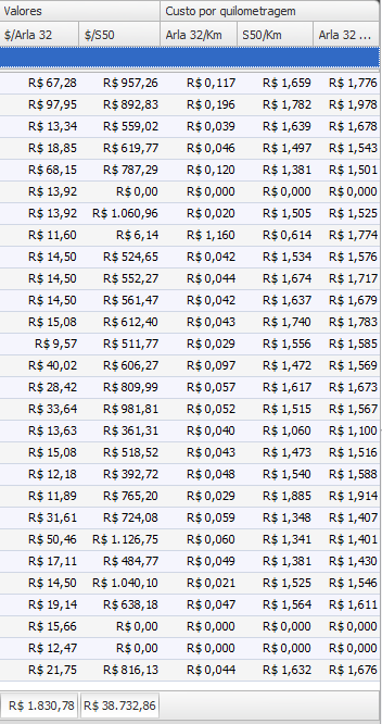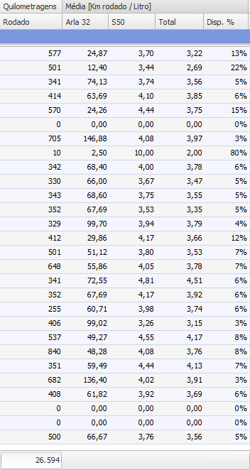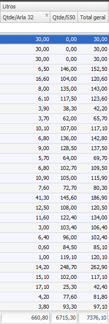 Litros - colunas com totalizador Qtde/ARLA 32 - Quantidade de ARLA 32 abastecido Qtde /S50 - Quantidade de combustível abastecido