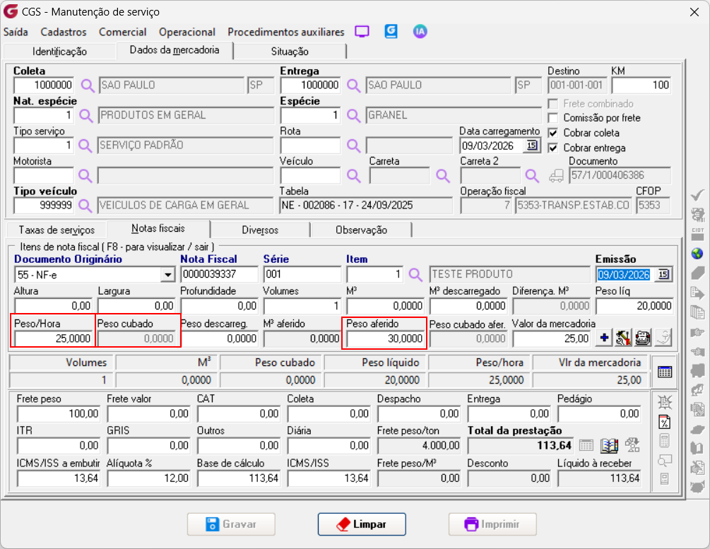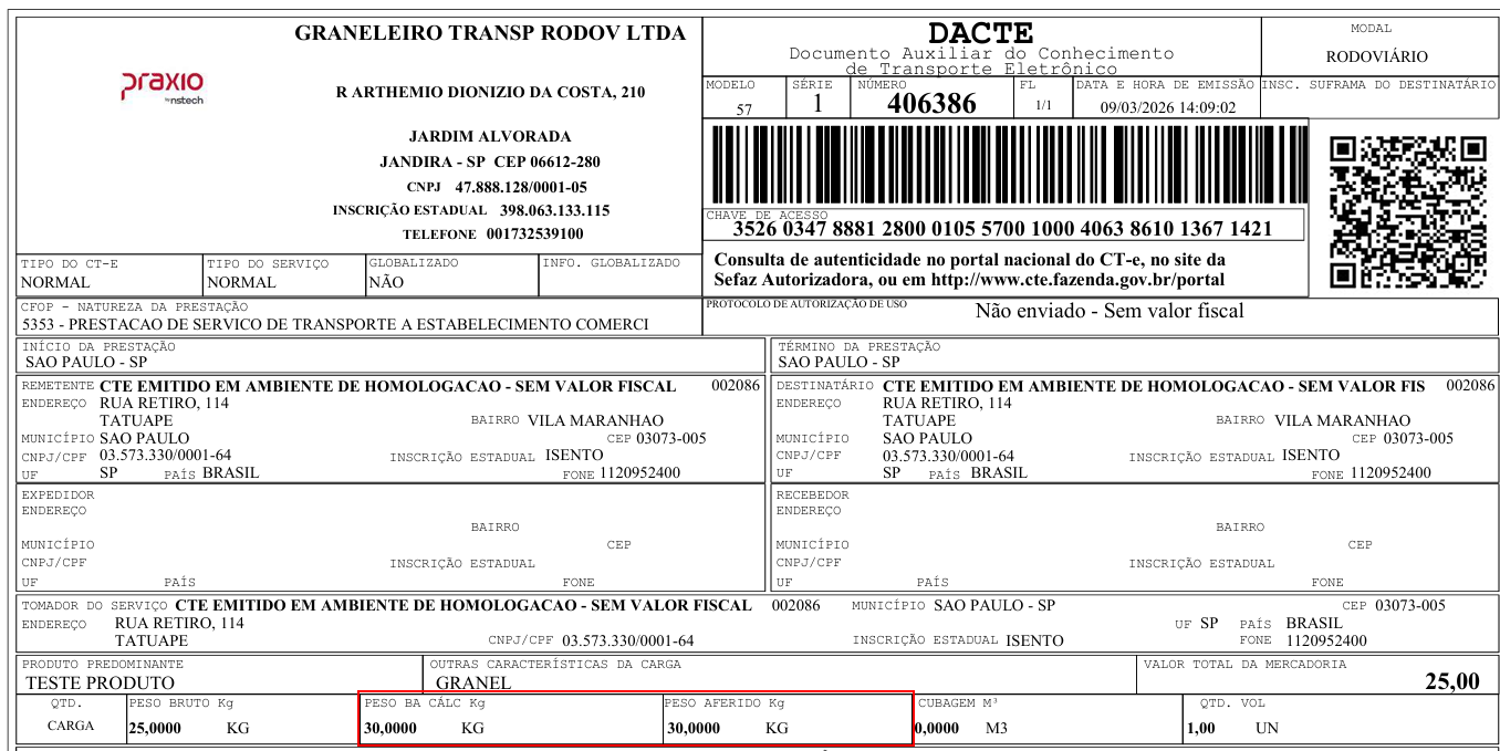Preenchimento do peso / base de cálculo da dacte. |