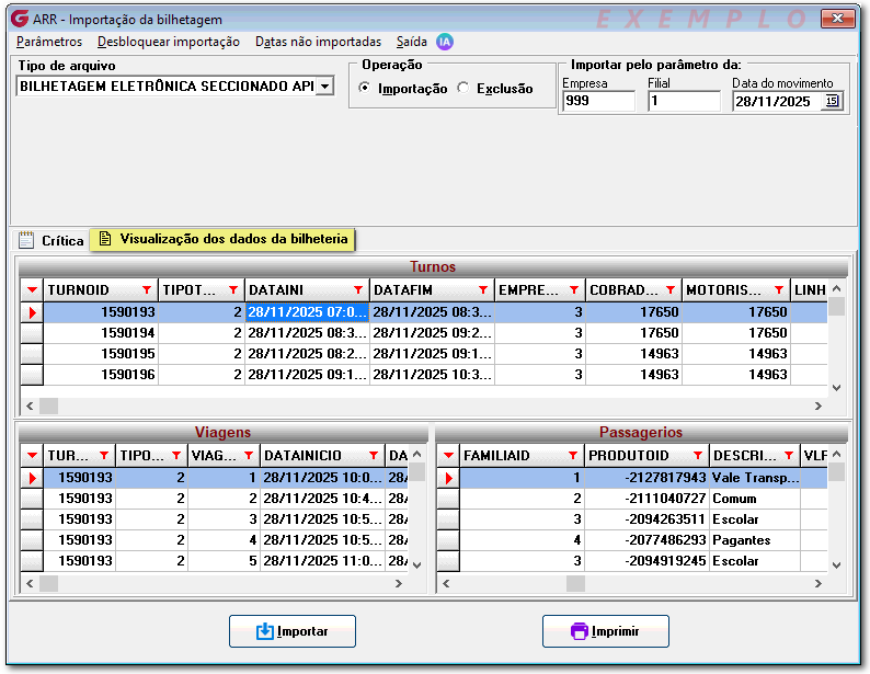 Tarifas criadas de forma automática com os tipos de pagamento já associados (Módulo Tráfego) Menu Valores >> Tarifas (aba Tarifa por Tipo de Pagamento) Ao final da importação, tendo sido realizada com sucesso ou apresentando críticas, será possível visualizar os dados lidos na aba "Visualização dos dados da bilheteria".