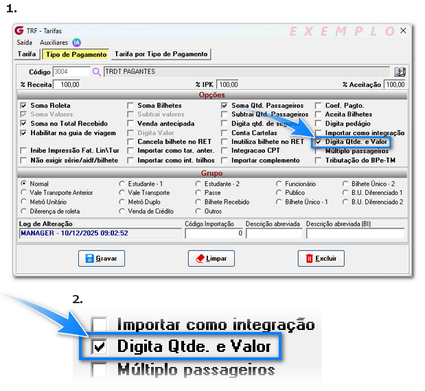 (Módulo Tráfego) Menu Valores >> Tarifas (aba Tipo de Pagamento)