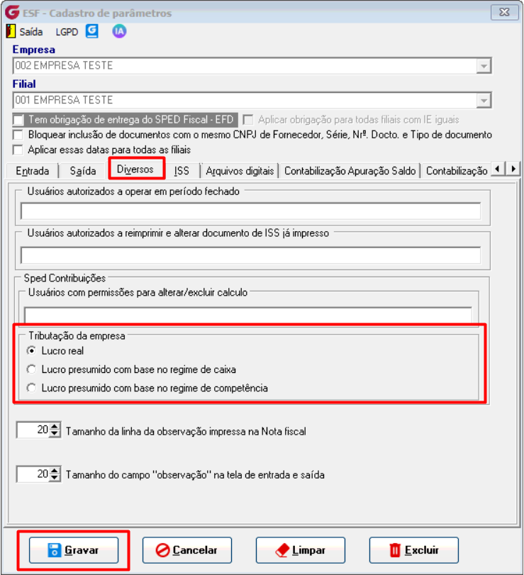 Informe empresa e filial, e na aba DIVERSOS escolha o Regime de Tributação da empresa.