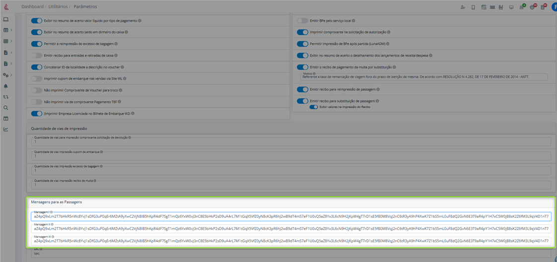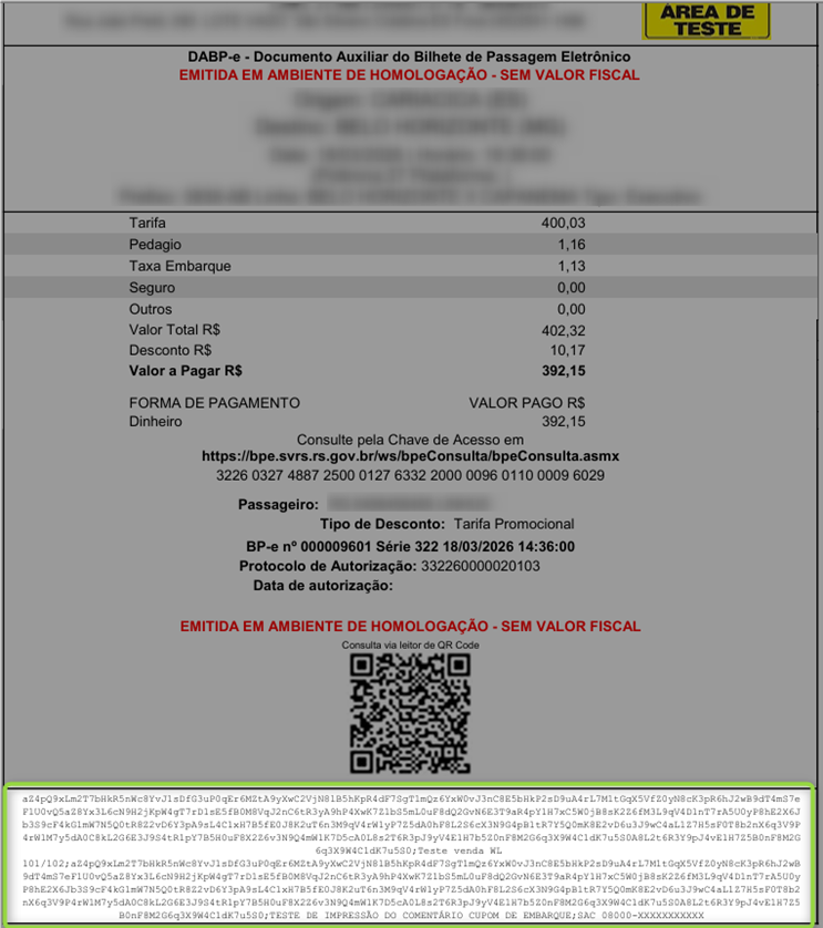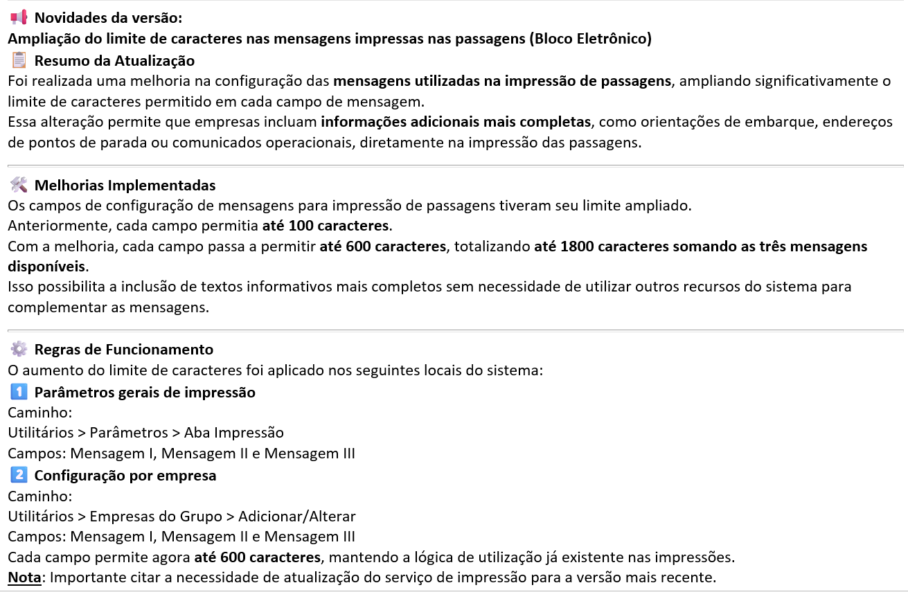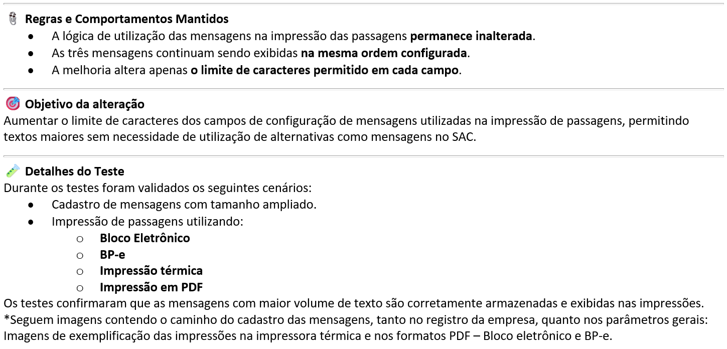 Ampliação do limite de caracteres nas mensagens impressas nas passagens (Bloco Eletrônico). |