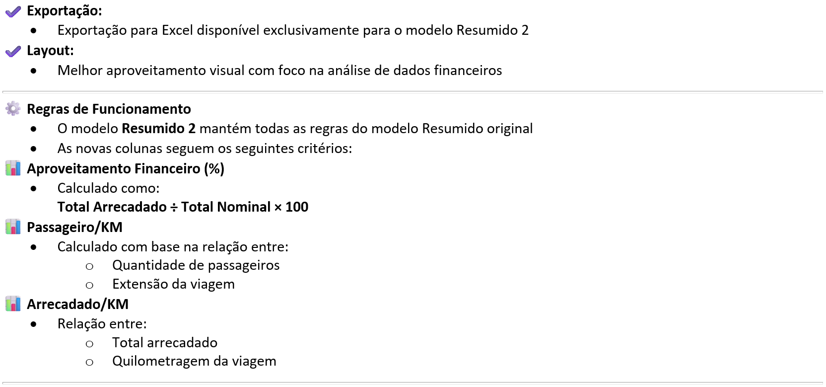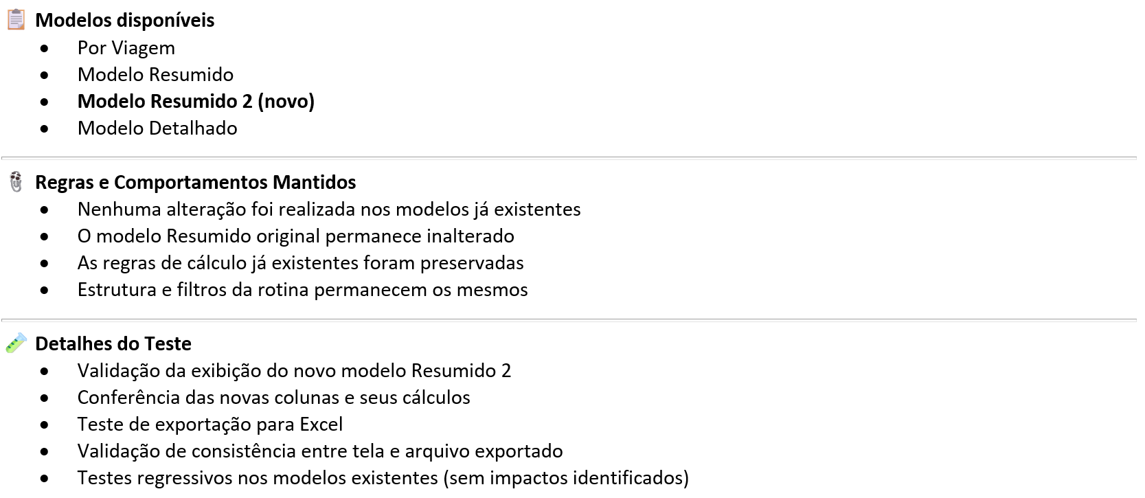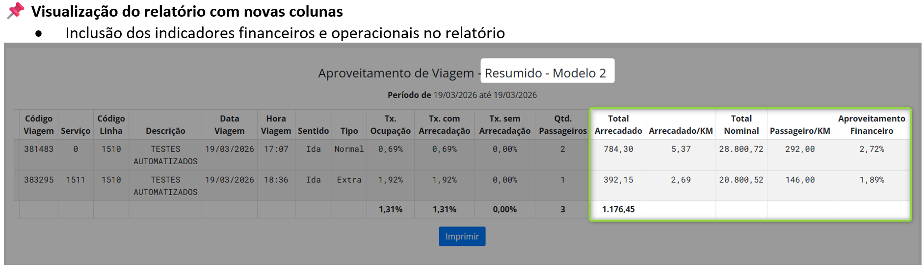 Novo modelo de relatório com indicadores financeiros no Aproveitamento de Viagem. Modelo Resumido 2 |