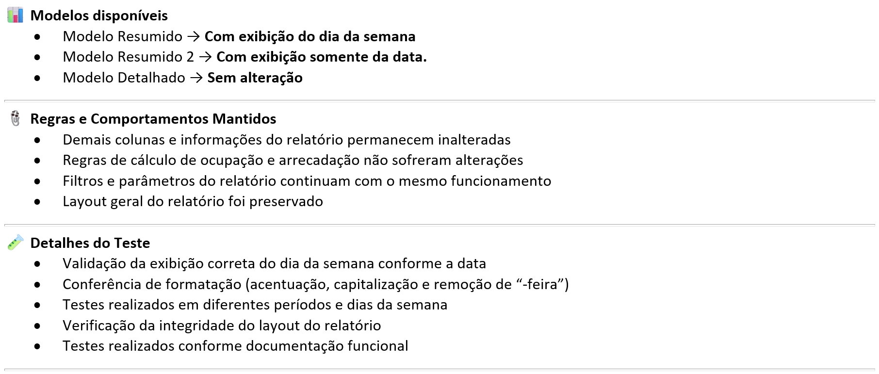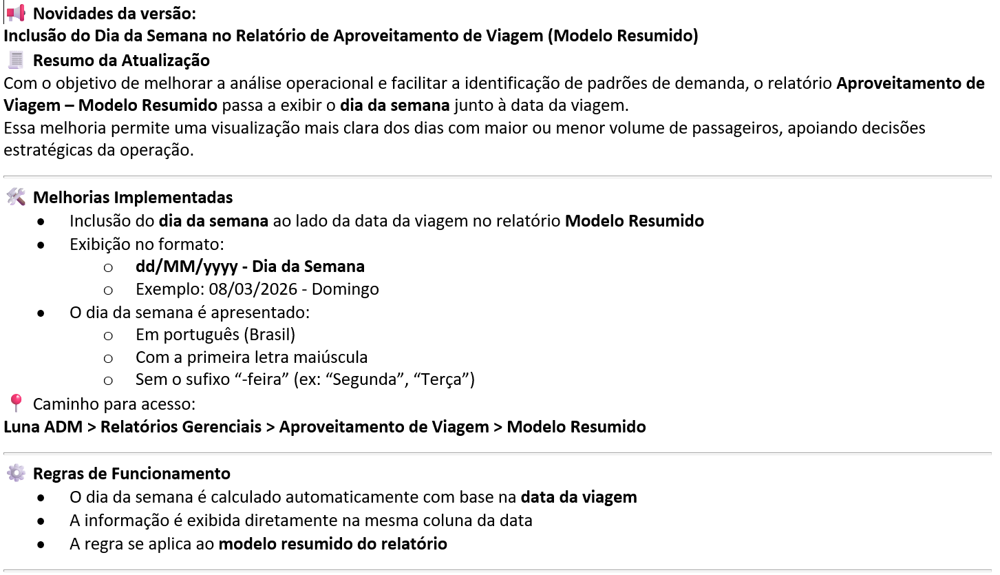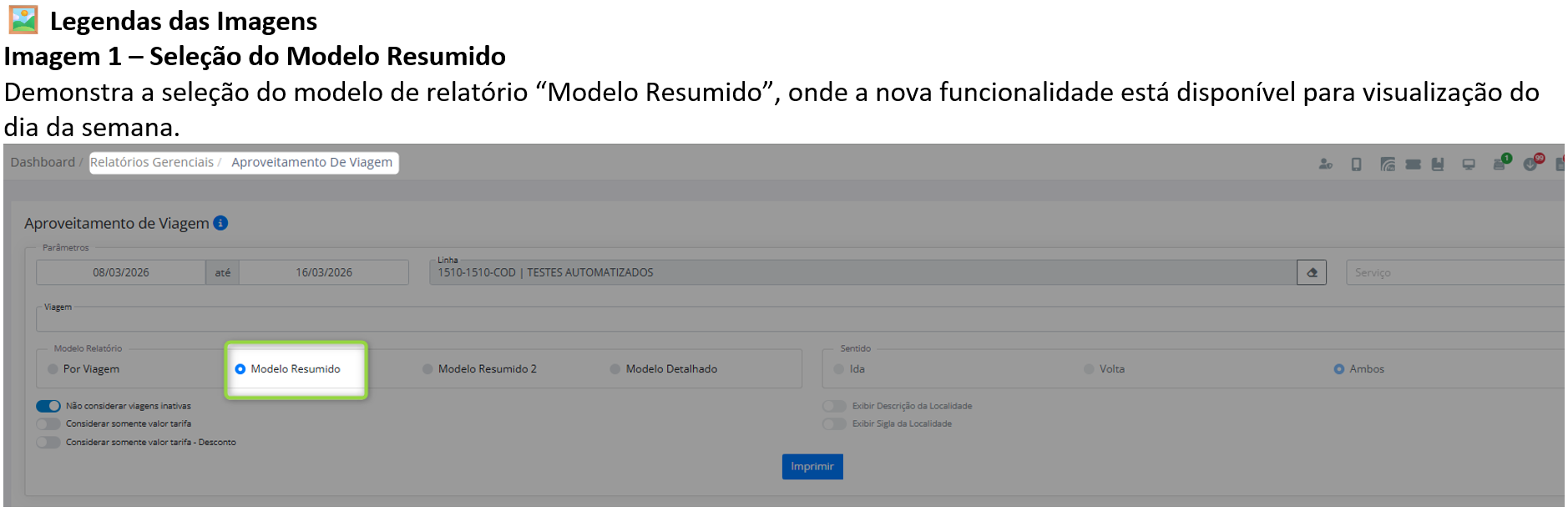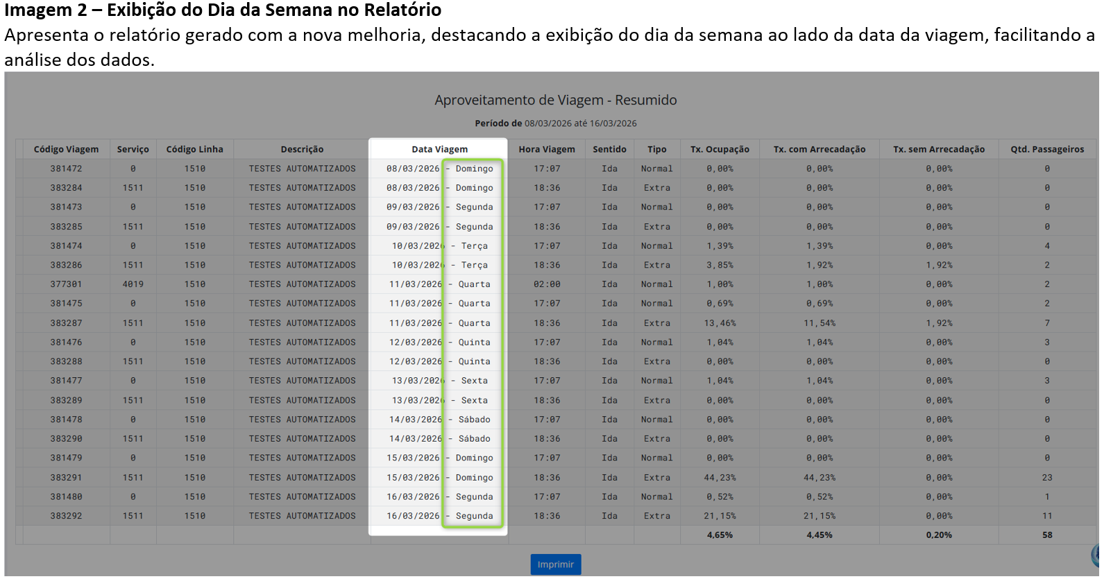 Inclusão do Dia da Semana no Relatório de Aproveitamento de Viagem (Modelo Resumido). |