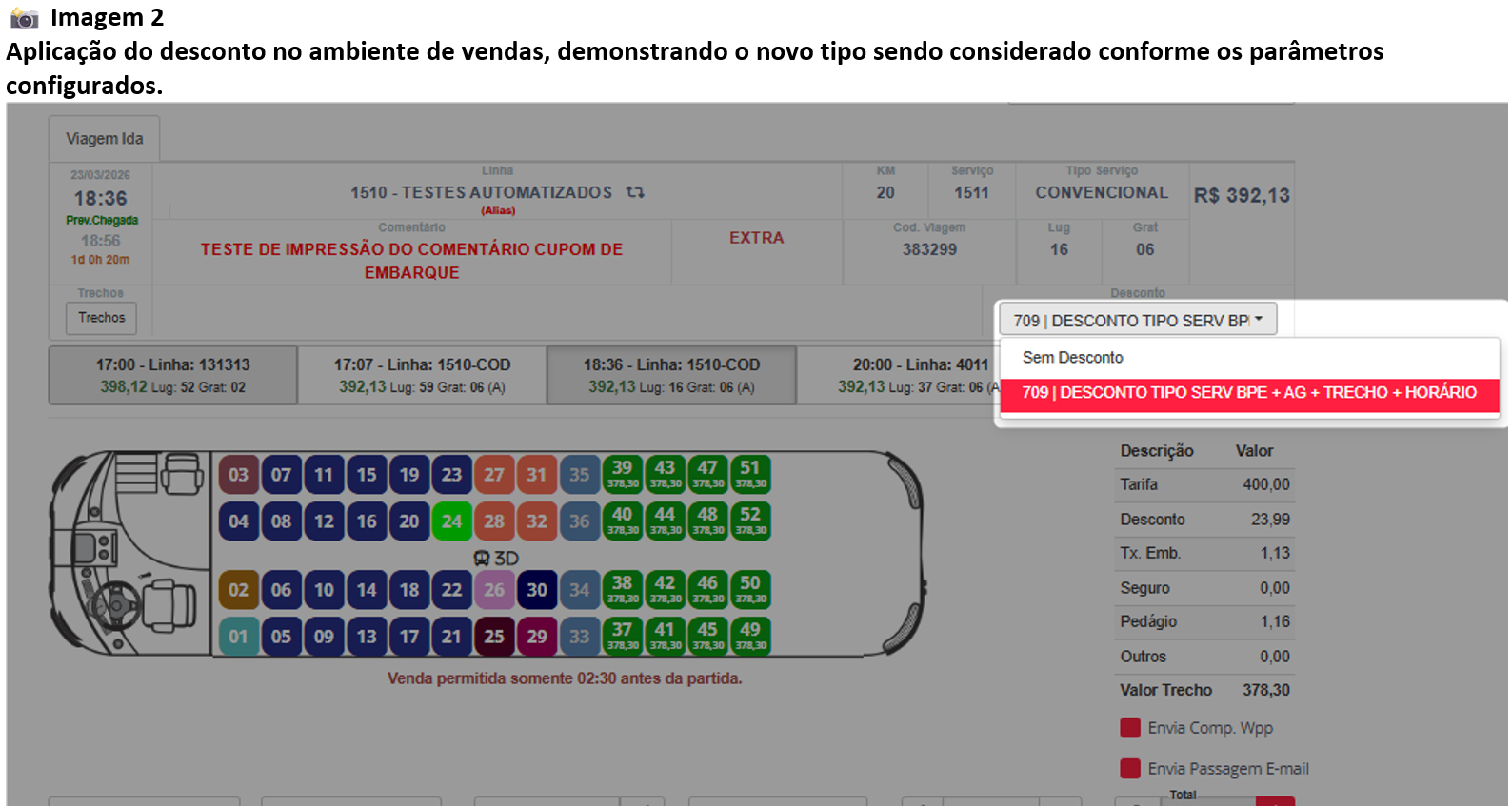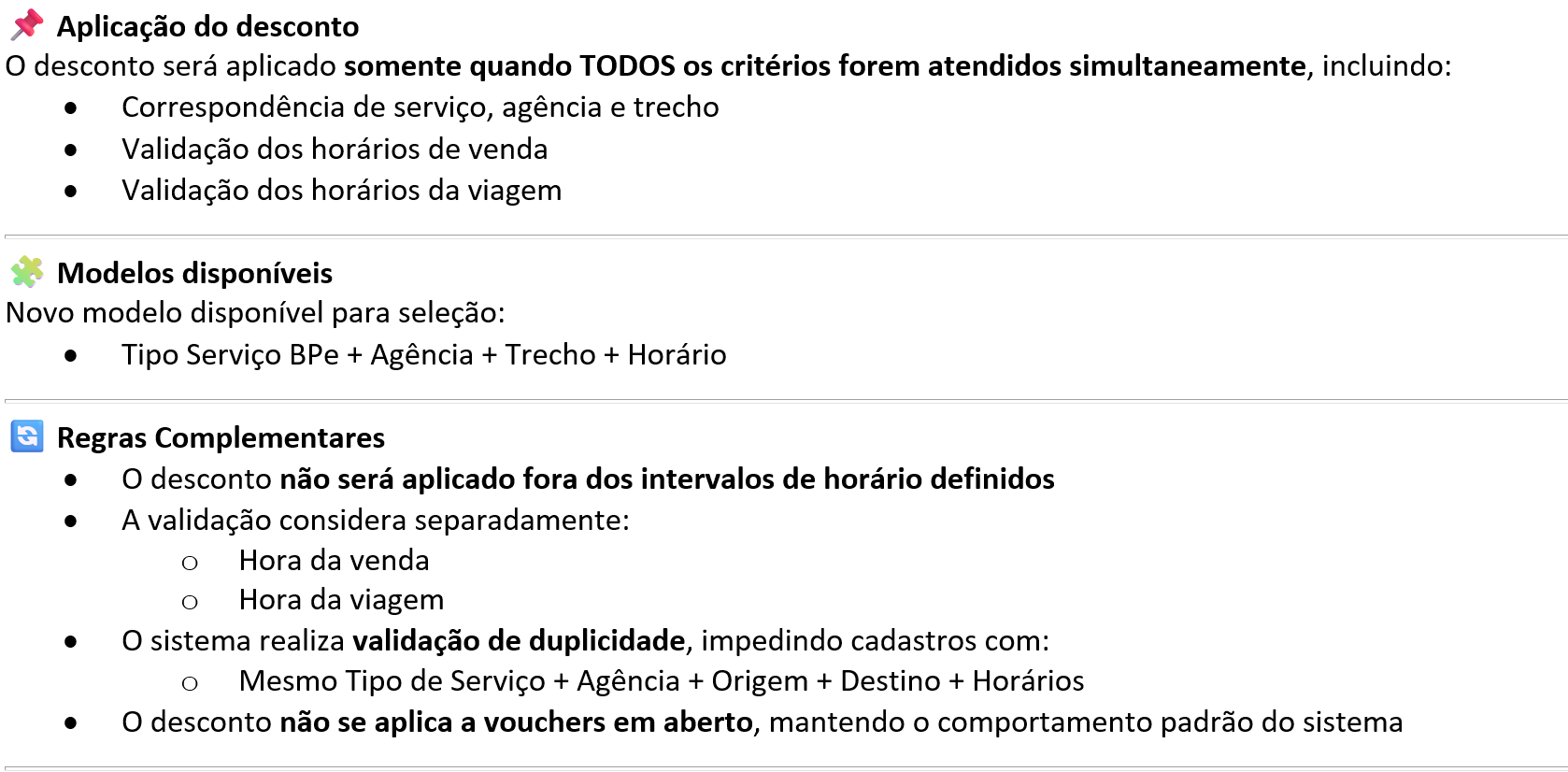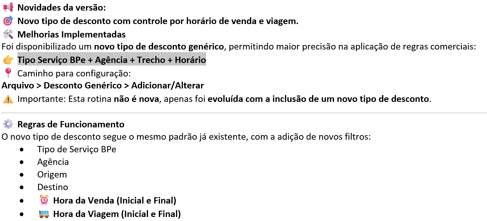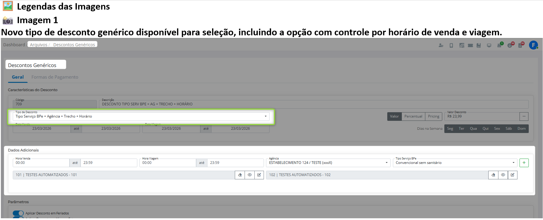 Novo tipo de desconto com controle por horário de venda e viagem. Tipo Serviço BPe + Agência + Trecho + Horário |