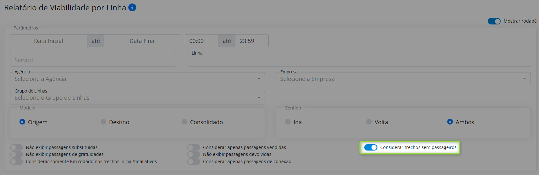 Inclusão de parâmetro para considerar trechos sem passageiros no relatório de viabilidade |