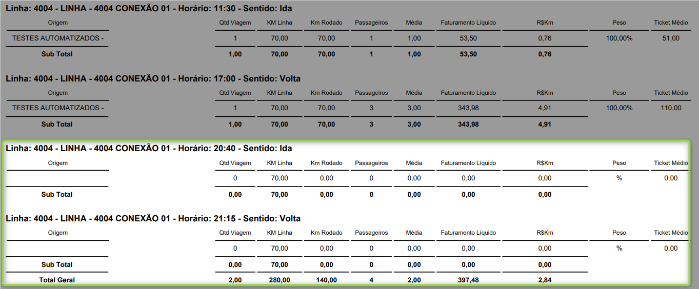 Figura 02 - Imagem ilustrativa dos registros do relatório “Viabilidade por linha”. Destaque para os registros de trechos sem passageiros. *Portal Web Luna ADM. Nomes, documentos e telefones lançados nesse teste, são meramente fictícios. “Atendendo assim as normas da LGPD”. |