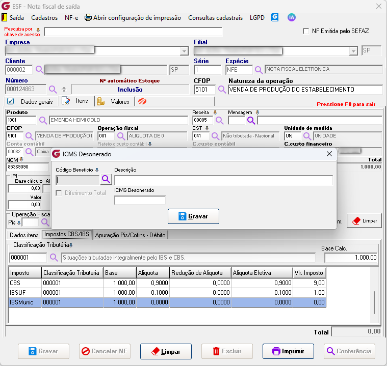 Ao término da inclusão do item, após a inserção dos impostos CBS/IBS, será exibida a tela de ICMS Desonerado.