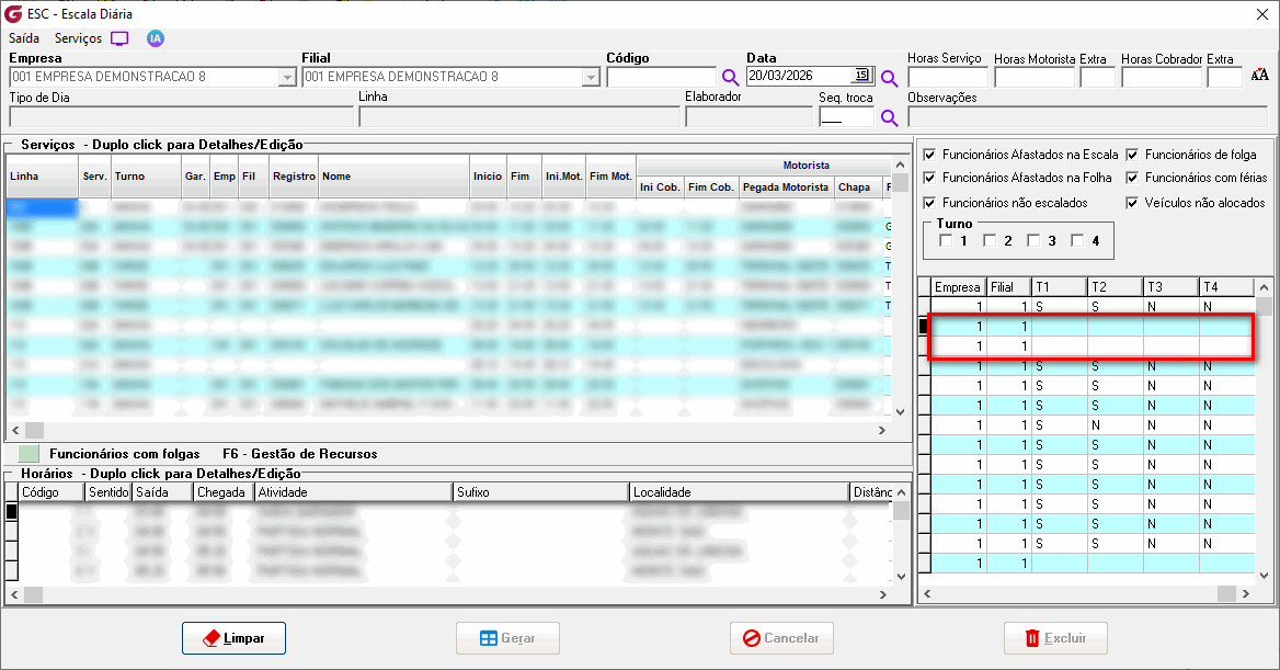 A escala diária possuí um facilitador para o colaborador através da tecla de atalho F6 que permite uma consulta de recursos (Funcionários e veículos) disponíveis e que não estão alocados em nenhum serviço. Além dos filtros já existentes foram aplicados filtros de turnos para reduzir o número de registros que podem ser utilizados em comparação com o turno do serviço, auxiliando o colaborador, a utilizar funcionários parametrizados para um turno em questão. |