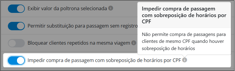 O que há de novo: Foi adicionado ao Portal Web Luna ADM o novo parâmetro “Impedir compra de passagem com sobreposição de horários por CPF” que, quando habilitado, ativa a funcionalidade de bloqueio de venda de passagens para um mesmo passageiro em viagens com sobreposição de horários no Portal Web Luna (Vendas). Ao habilitar o parâmetro, o sistema passa a validar automaticamente se o passageiro já possui uma passagem adquirida para outra viagem cujo horário conflita com a nova tentativa de compra.