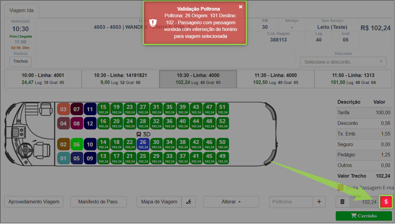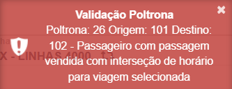 Figura 02 - Imagem ilustrativa da mensagem exibida na tela de vendas quando já existe uma passagem adquirida para o mesmo passageiro em uma viagem com sobreposição de horários em relação à tentativa atual de compra. A validação é realizada com base no CPF informado no momento da venda, garantindo que o passageiro não consiga adquirir passagens para viagens com conflito de horário. Figura 03 - Imagem ilustrativa da mensagem apresentada: “Passageiro com passagem vendida com interseção de horário para viagem selecionada”.