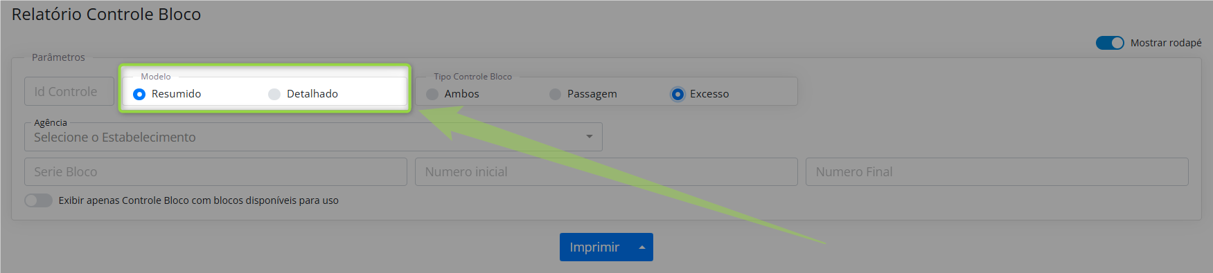 O modelo Resumido permanece disponível para todos os tipos de controle (Passagem e Excesso).