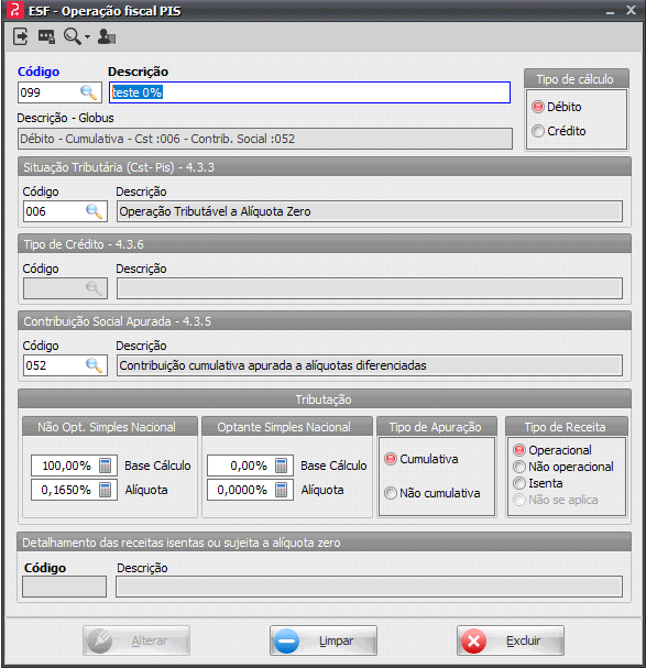 No caminho Cadastros>Apuração Pis e Cofins> Operação Fiscal Pis, preencha as informações para realizar o cadastro, também defina se o Tipo de Cálculo é Débito ou Crédito;