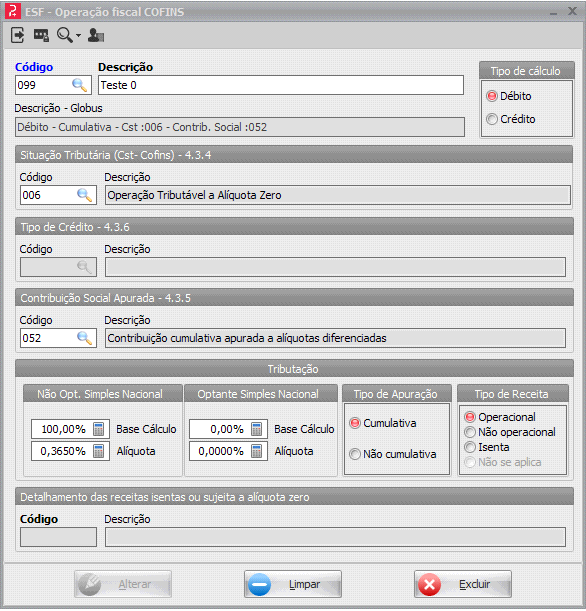 No caminho Cadastros>Apuração Pis e Cofins> Operação Fiscal Cofins, preencha as informações para realizar o cadastro, também defina se o Tipo de Cálculo é Débito ou Crédito;
