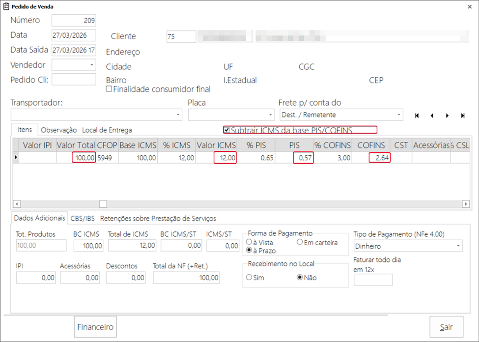 Com a marcação do parâmetro, o valor de ICMS subtrai a base de cálculo. Ou seja: 12,00 (ICMS) – 100,00 (Total Item) = 88,00 88,00 * 0,65 (alíquota pis) = 0,57 88,00 * 3,00 (alíquota cofins) = 2,64 * Nomes, documentos e telefones lançados nesse teste, são meramente fictícios. “Atendendo assim as normas da LGPD”. |
