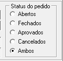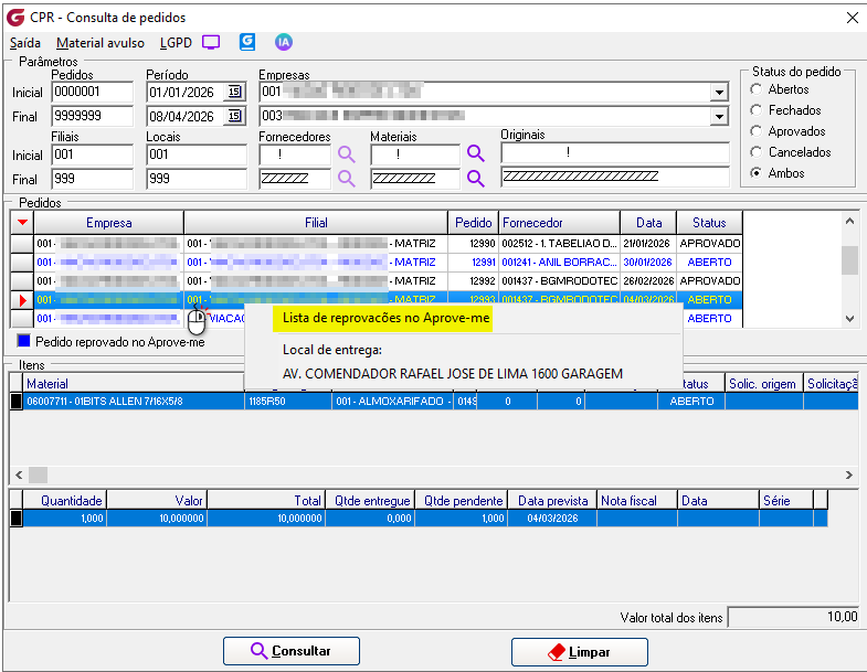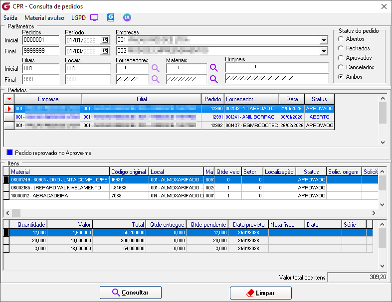 Pedido> Consulta ![]() Clique no menu "Material avulso" para consultar pedidos de compras de materiais avulsos/serviços. Parâmetros Pedidos | Inicial/Final - Defina um intervalo de pedidos Período | Inicial/Final - Defina um intervalo de datas Empresas | Inicial/Final - Defina um intervalo de empresas Filiais | Inicial/Final - Defina um intervalo de filiais Locais | Inicial/Final - Defina um intervalo de locais Fornecedore | Inicial/Final - Defina um intervalo de fornecedores Materiais | Inicial/Final - Defina um intervalo de materiais Originais| Inicial/Final - Defina um intervalo de códigos originais dos materiais Status do Pedido Escolha um status do pedido: abertos, fechados, aprovados, cancelados ou ambos.