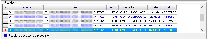 Grid de pedidos No grid de pedidos são apresentados Empresa - Código e descrição Filial - Código e descrição Pedido - Número do pedido Fornecedor - Código e descrição Data - Data de geração do pedido Status - Condição atual do pedido
