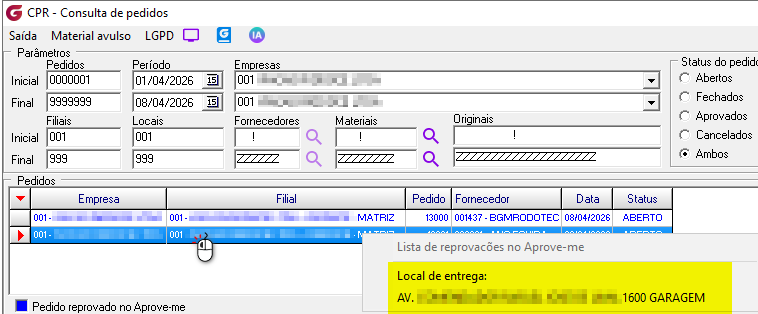 Clicando com o botão direto sobre o pedido é possivel consultar o local de entrega.