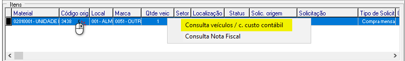 Clique com o botão direito do mouse sobre o item e selecione a opção "Consulta veículos/c.custo contábil"