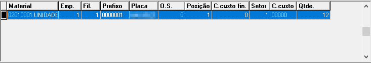 É apresentado grid com os dados: Material - Código e descrição Empresa - Código da empresa do veículo Filial - Código da filial do veículo Prefixo - Prefixo do veículo Placa - Placa do veículo OS - Número de OS quando informada Posição - Código da posição do material no veículo C.custo fin - Código do centro de custo financeiro quando informado Setor - Código do setor C. custo - Código do centro de custo contábil Qtde. - Quantidade de itens associados ao veículo
