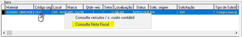 Clique com o botão direito do mouse sobre o item e selecione a opção "Consulta Nta Fiscal"