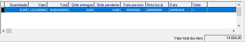 É apresentado grid com os dados: Número - Numero da nota fiscal Data de emissão - Data de emissão da nota fiscal No grid inferior dos itens são apresentados os dados: Quantidade - Quantidade do item Valor - Valor unitário do item Total - Valor total do item Qtde entregue - Quantidade já recebida do material Qtde pendente - Quantidade aguardando entrega Data prevista - Data prevista para entrega Nota fiscal - Número da nota fiscal em que o material foi lançado Data - Data de lançamento da nota fiscal Série - Código de série da nota fiscal